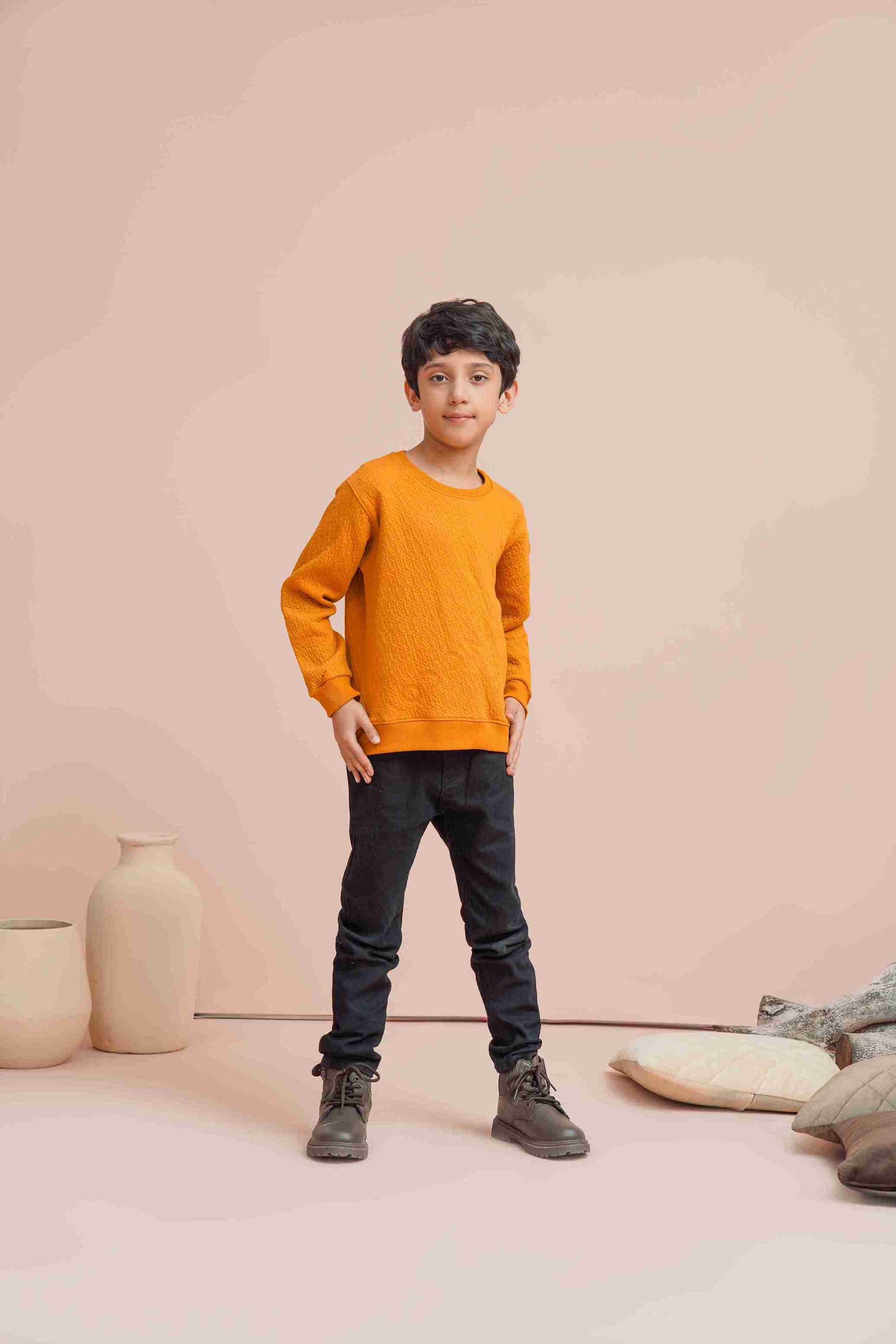 Crafted from soft, high-quality fabric, this sweatshirt ensures all-day comfort while keeping your child cozy during chilly days. The rich mustard color adds vibrancy, while the embossed texture gives a trendy, fashionable twist to classic casual wear.